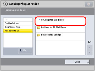 → [Function Settings] → [Store/Access Files] → [Mail Box Settings] → [Set/Register Mail Boxes].