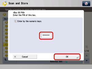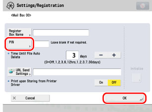 Press [PIN] →enter a seven digit PIN for the Mail Box → press [OK] → [Close].