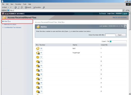 Access the Remote UI → click [Access Received/Stored Files] → [Mail Box].