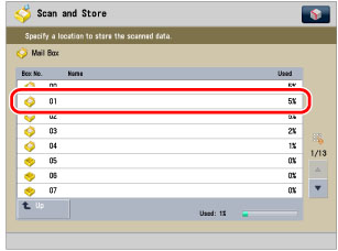 Press [Mail Box] → select the Mail Box in which you want to store the document.