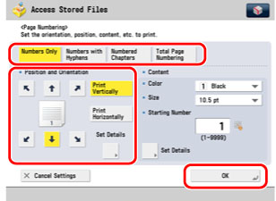 Select the type of numbering, and the orientation and position of the page numbers → press [OK].