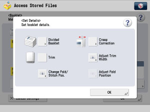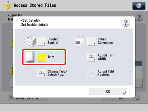 [Trim], [Adjust Trim Width], and [Adjust Fold Position] cannot be used, depending on the model of the machine and on attached optional products. For information on the optional products, see "Optional Products/Software."