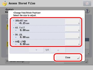If the staple position is not centred, press [Change Fold/Stitch Pos.].