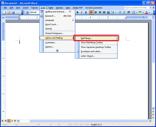 Open a new document on Microsoft Word → click [Tools] → [Letters and Mailings] → [Mail Merge].