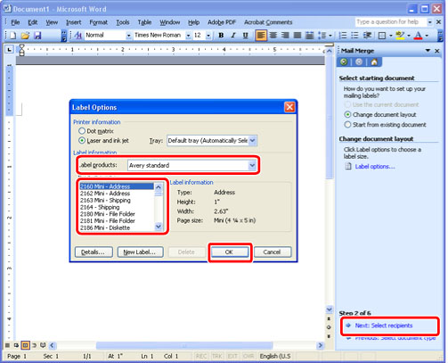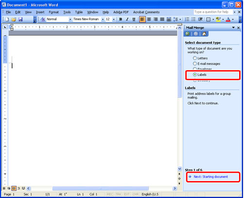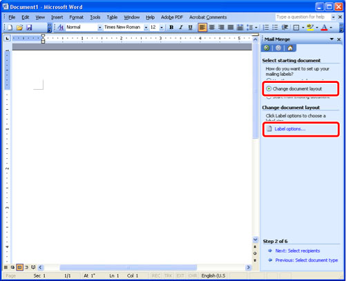 Select [Change document layout] for [Select starting document] → click [Label options].
