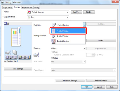 In the [Finishing] sheet, select [1-sided Printing] from [Print Style].