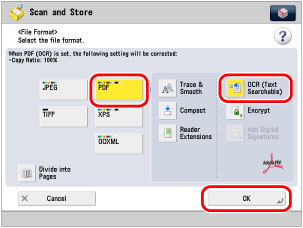 Select [PDF] → [OCR (Text Searchable)] →press [OK].