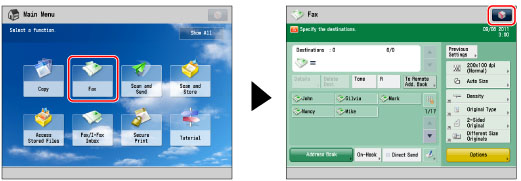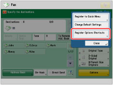 Four options shortcuts are displayed on the Fax Basic Features Screen. [Density], [Original Type], [2-Sided Original], and [Different Size Originals] are displayed as default. These shortcuts can be changed to functions that you frequently use.