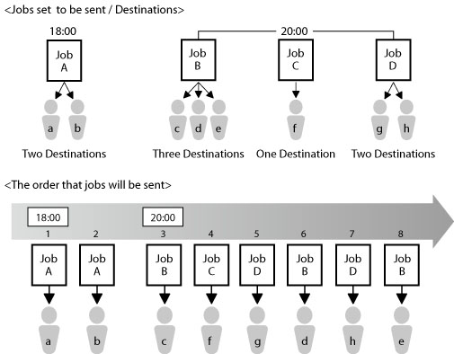 If multiple fax jobs reach their delayed send time simultaneously, documents are sent in the order indicated in the illustration below.
