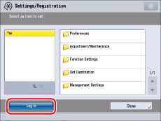 Some items on the Settings/Registration screen may be restricted for general users. Items that a user does not have operating privileges for are grayed out and cannot be selected on the touch panel display. Items that a user does not have operating privileges for are not displayed on the Remote UI.