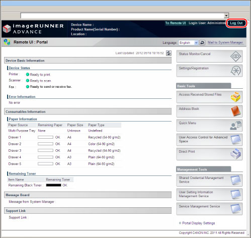 For information on the Remote UI system requirements and preliminary steps to launch the Remote UI, see "System Requirements" and "Before You Start the Remote UI."