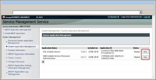 Click [Start] or [Stop] for the application that you want to start/stop.