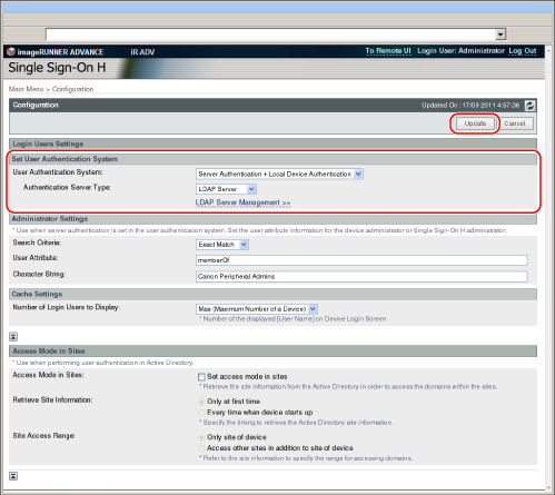 In addition to the Local Device Authentication administrator, the Server Authentication administrator can also set the user authentication system.