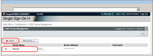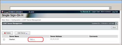 When clicking [LDAP Server Management], the display switched to the [LDAP Server Management] screen with settings in [Configuration] stored.