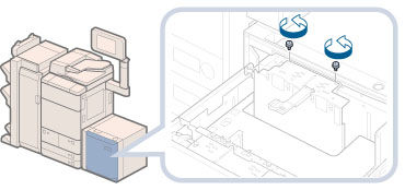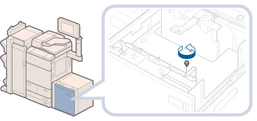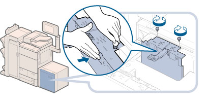 If you fasten the blue screws without pressing the inner size change plate away from you, the plate may be fixed at an angle. If you use the paper deck with a tilted inner size change plate, paper may be fed as slanted, poor print quality may result, and paper jams may occur. Therefore, make sure to fasten the blue screw while pressing the inner size change plate away from you.