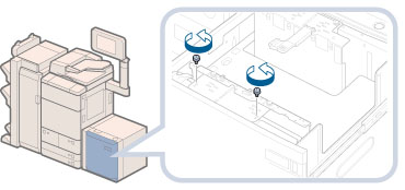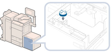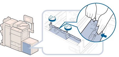 If you fasten the blue screws without pressing the outer size change plate towards you, the plate may be fixed at an angle. If you use the paper deck with a tilted outer size change plate, paper may be fed as slanted, poor print quality may result, and paper jams may occur. Therefore, make sure to fasten the blue screw while pressing the outer size change plate towards you.