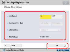 Press [Ethernet Driver Settings] for [Network] → specify the following items → press [OK].