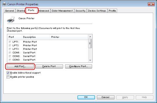 In the printer properties dialog box, click [Configure Port].
