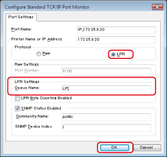 Select [LPR] in [Protocol] → enter the print queue name in [Queue Name] in [LPR Settings] → click [OK].