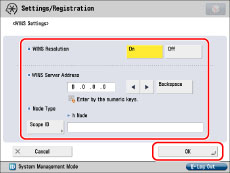 If you want to use WINS name resolution, press [On] for <WINS Resolution>. Enter the IP address of a WINS server in [WINS Server Address].