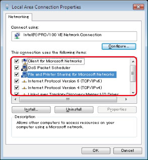 In the [Local Area Connection Properties] dialog box, select [Client for Microsoft Networks], [File and Printer Sharing for Microsoft Networks], and [Internet Protocol (TCP/IP)]/[Internet Protocol Version 4 (TCP/IPv4)].