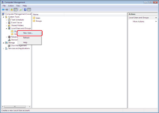 In the [Computer Management] window, double-click [Local Users and Groups] in [System Tools] → right-click the [Users] folder.