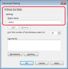 On the [Sharing] sheet, select [Share this folder] → enter the share name in [Share name].