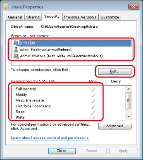 In the Active Directory environment, the procedures for specifying the security settings of the shared folder differ from above. For more information, see the Windows manual.