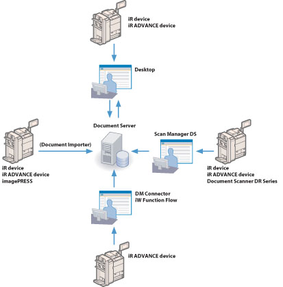 Documents imported with iW Scan Manager DS can be released to "Document Server," which is the core iW series software product utilised in various business situations.