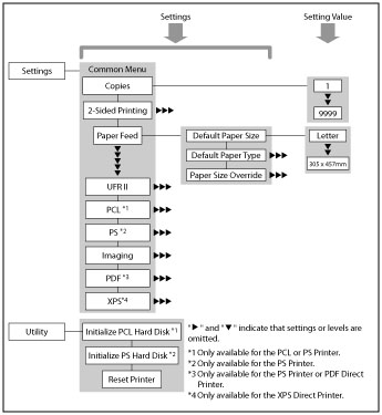 The Printer Settings menu enables you to access common features. Below is an abbreviated outline of the Printer Settings menu structure.