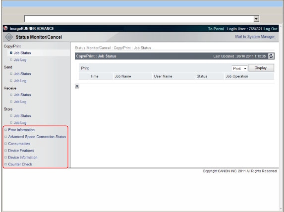 Displays the optional equipment (such as the finisher) that is attached to the machine and the functions that are available with the current system configuration.