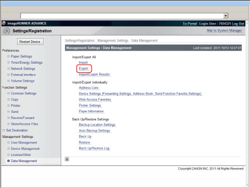 During the Export All operation, the Remote UI cannot be used to perform operations (Status Monitor/Cancel, Settings/Registration, Access Received/Stored Files, Address Book, Direct Print).