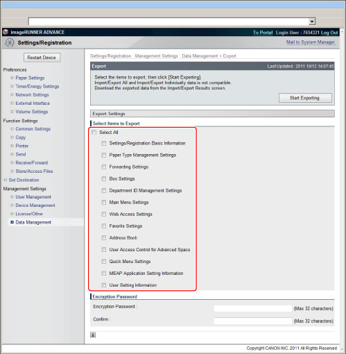 If you import the Department ID Management Settings when using the Import All function, system manager information settings such as an ID or password are overwritten. Check the system manager information of the machine for exporting before using the Export All function, as it is required when logging in to the destination machine for importing.