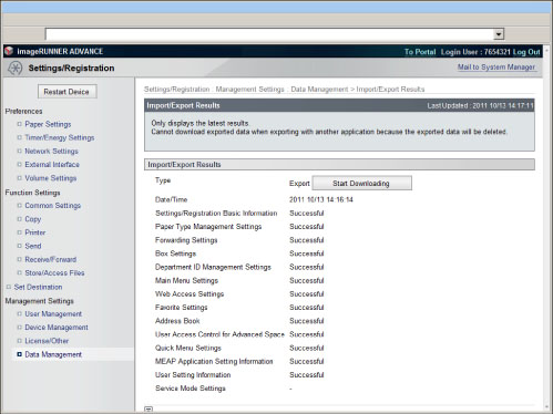 You can also check the latest import/export results by pressing [Data Management] for <Management Settings> → [Import/Export Results].