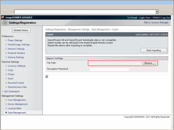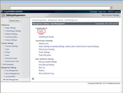 If you import the Department ID Management Settings when using Import All function, system manager information settings such as an ID or password are overwritten. Check the system manager information of the machine for exporting before using Export All function, as it is required when logging in to the destination machine for importing.