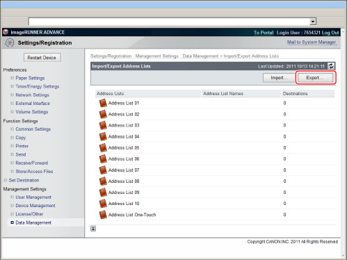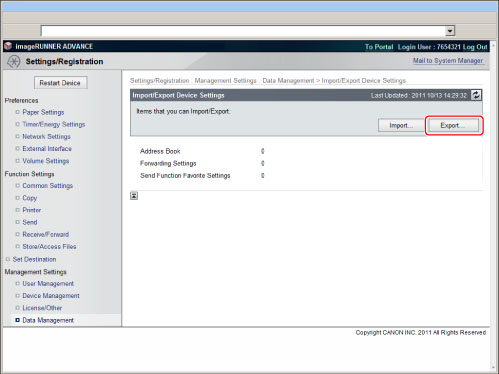Click [Device Settings (Forwarding Settings, Address Book, Send Function Favorite Settings)] for <Import/Export Individually> → [Export...].