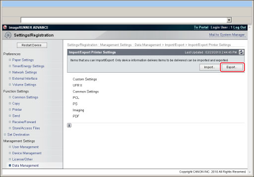 Click [Printer Settings] for <Import/Export Individually> → [Export...].