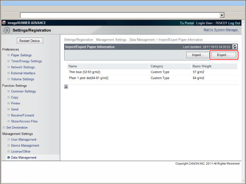 Click [Paper Information] for <Import/Export Individually> → [Export...].