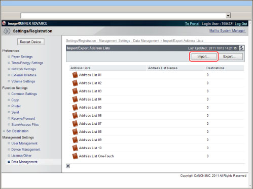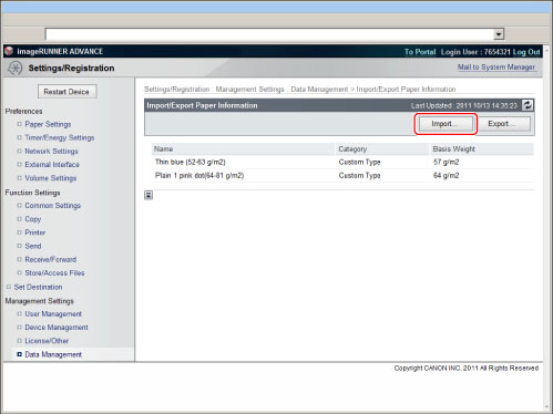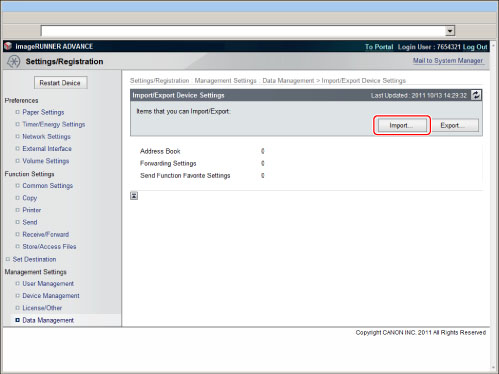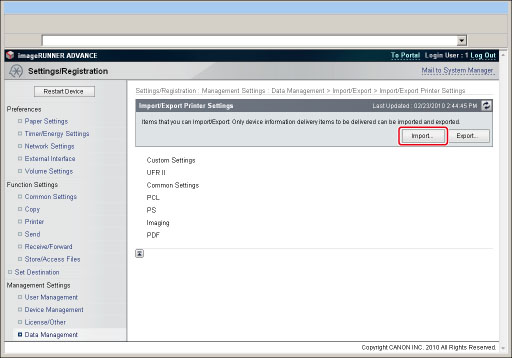 After importing device settings, the Remote UI cannot be used to perform other operations until the machine is restarted. Turn OFF the main power of the machine, and turn the main power back ON again.