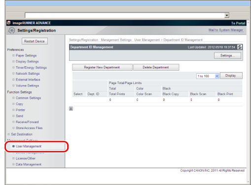 The Department ID Management settings are the same as those that you can access from the control panel of the machine by pressing [User Management] (Settings/Registration) → [Department ID Management]. For instructions on using the control panel to specify Department ID Management settings and more information on Department ID Management, see "Department ID Management."