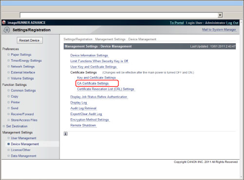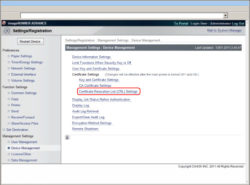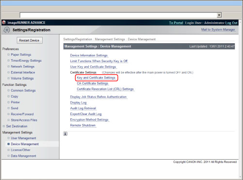Click [Settings/Registration] → [Device Management] for <Management Settings>.