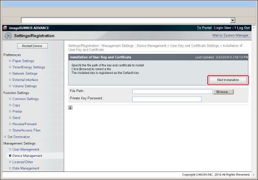 You can use the Remote UI to install the key pair, user certificate, and certificate revocation list required for user signatures in the machine.