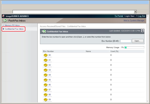 You can also select the desired inbox by entering its number next to <Box Number (00-49)> → click [Open...].