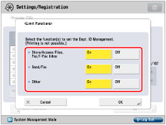 If [Department ID Management] is set to [On], functions other than described above and MEAP applications operate as explained below regardless of limit function settings.