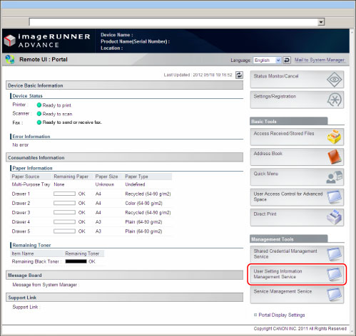 To specify each setting for User Setting Information Management Service, it is necessary to access and then log in to the machine from the Web browser. This section describes the procedure for accessing the machine from the portal page of the Remote UI.
