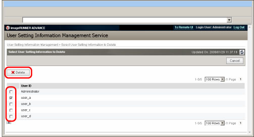 You cannot delete the user setting information for the user who is logged in as an administrator.