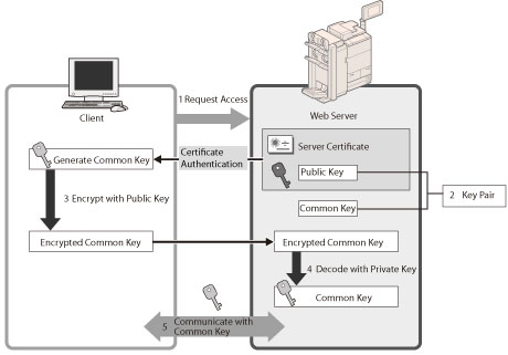 When the user accesses the machine from their computer, the server certificate for SSL and the public key for the server are requested.
