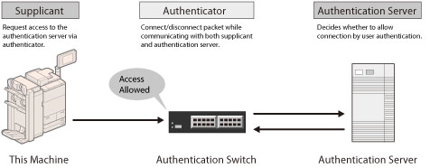 Manages all of the authentication information via the authentication server (RADIUS: Remote Authentication Dial In User Service) and authenticates the supplicant. You can prevent unauthorized access because only the supplicant authenticated by the RADIUS server has permission to connect to the network by the authenticator.