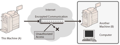 You can perform safe encrypted communication when the user is accessing the machine via a Web browser by installing a server certificate to the machine. With SSL communication, a common key that can only be used by the user and the machine is generated using the server certificate and public key. Doing so will help prevent data interception and theft. See
