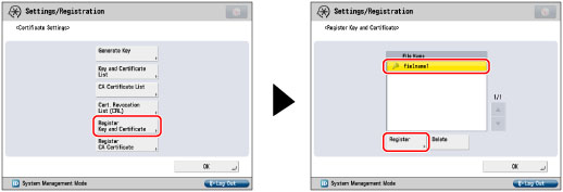 Press [Register Key and Certificate] → select the file to register → press [Register].